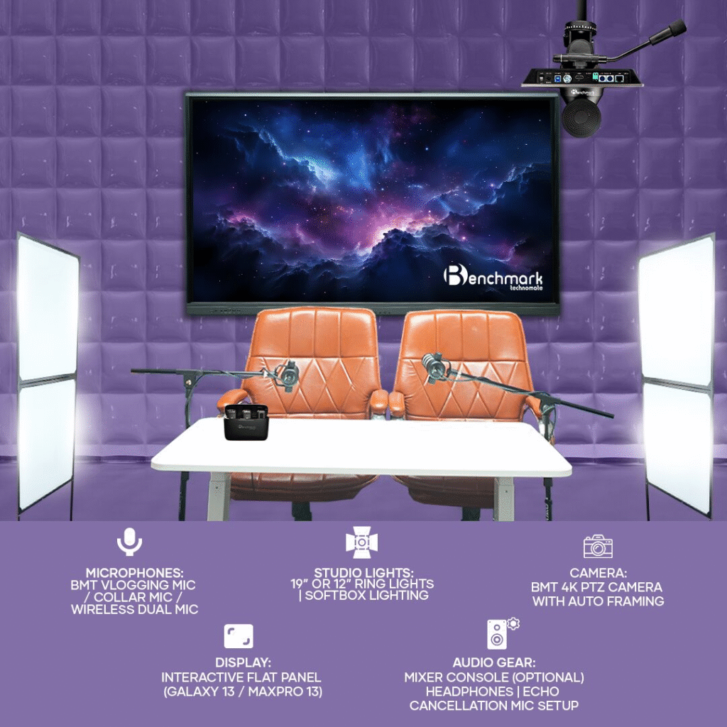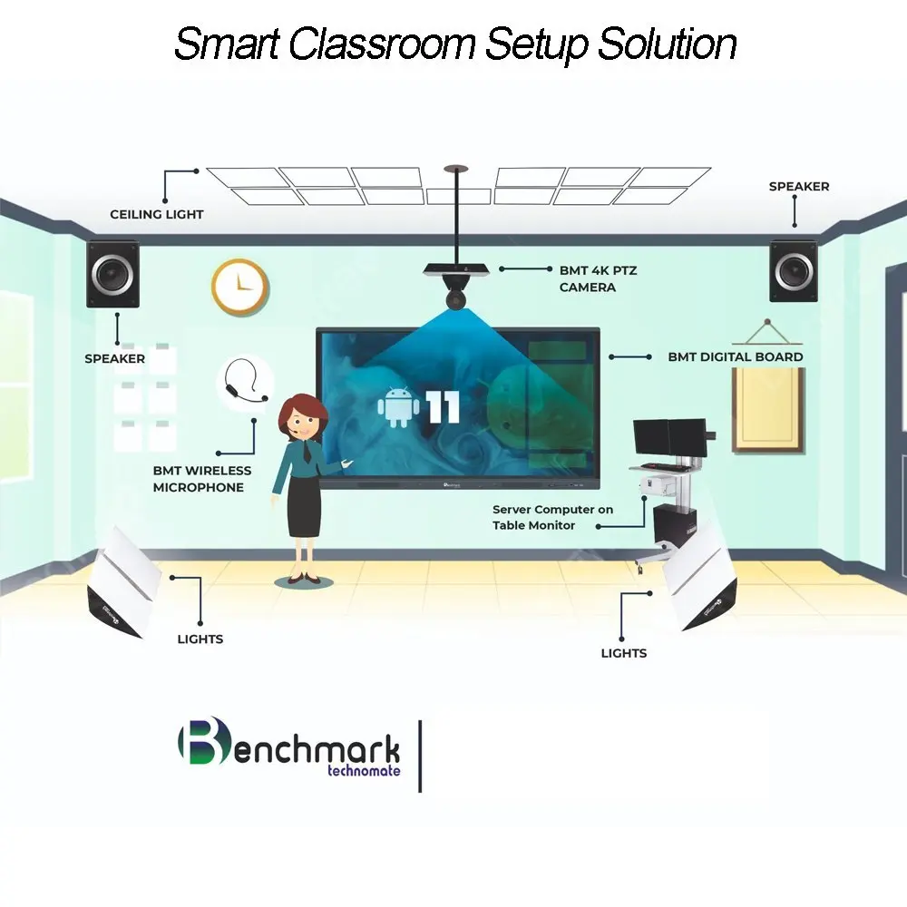 Benchmark ke AI Smart Boards, PTZ Cameras, Mic & Smart Light Solutions se aap apne classroom ko ek profitable digital learning studio me badal sakte hain.