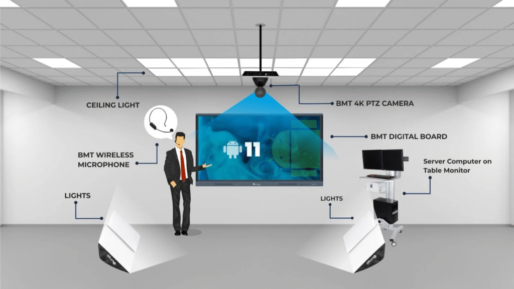 1. Smart Teaching Setup – Benchmark Interactive Boards, PTZ Cameras, Mic & Smart Lighting