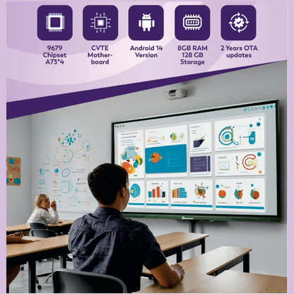 Teachers apne laptops, phones ya tablets directly screen se connect kar sakte hain. - Built-in Android 14 System: