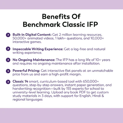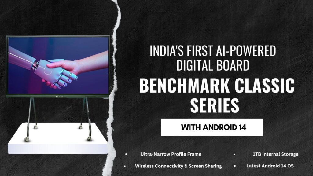 Benchmark Classic 14 (75-inch) ek premium smart interactive flat panel hai jo specially design kiya gaya hai teachers, institutes aur professionals ke liye jinko chahiye ek powerful yet affordable digital solution.