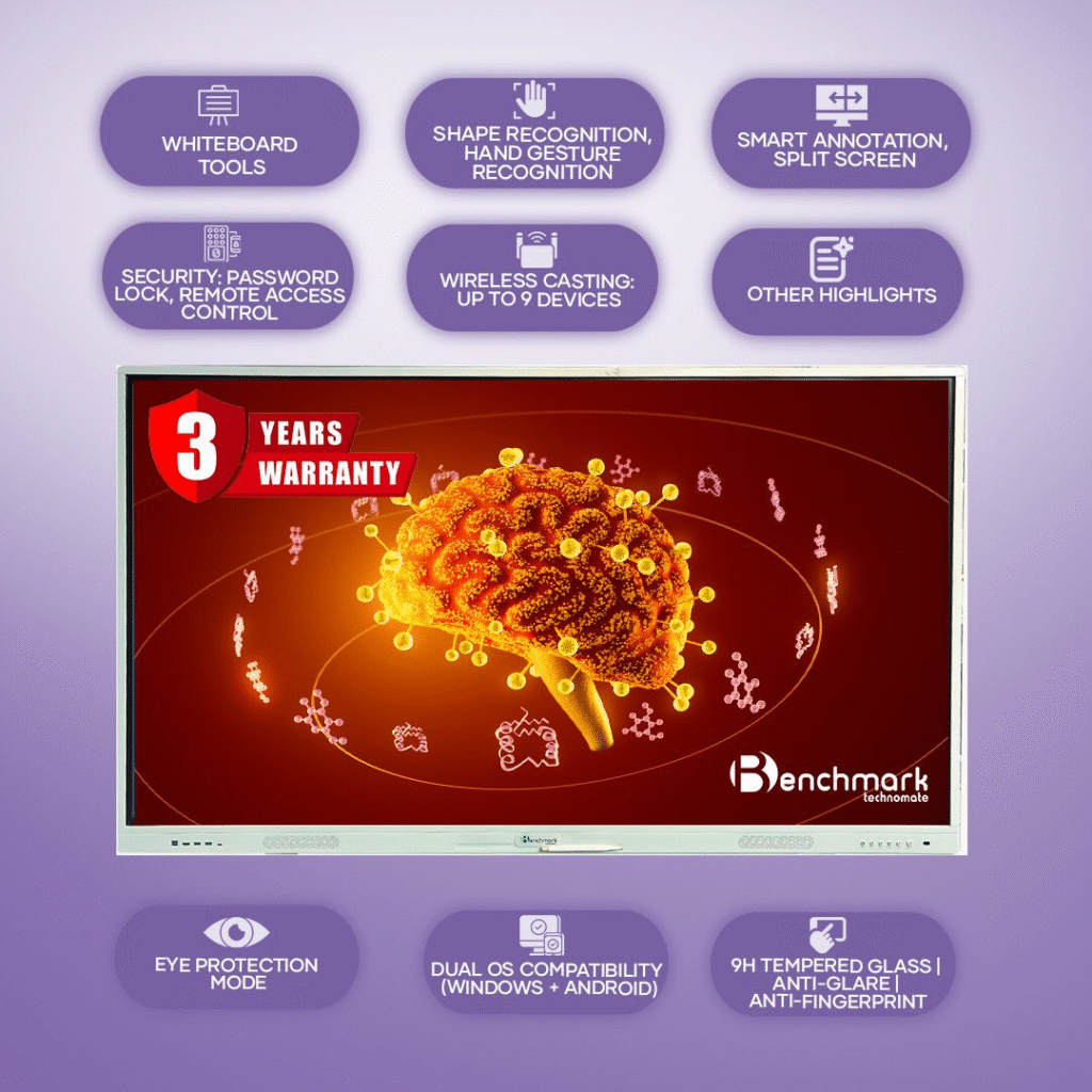 Benchmark Sigma AI 7 ek high-performance interactive flat panel hai jo specially design kiya gaya hai digital classrooms, coaching institutes aur corporate setups ke liye.