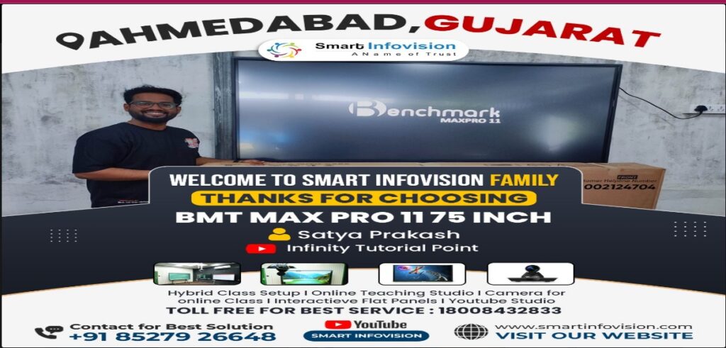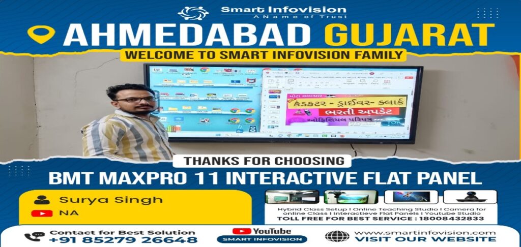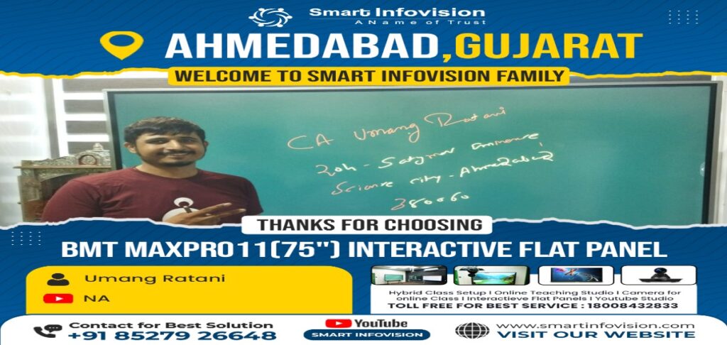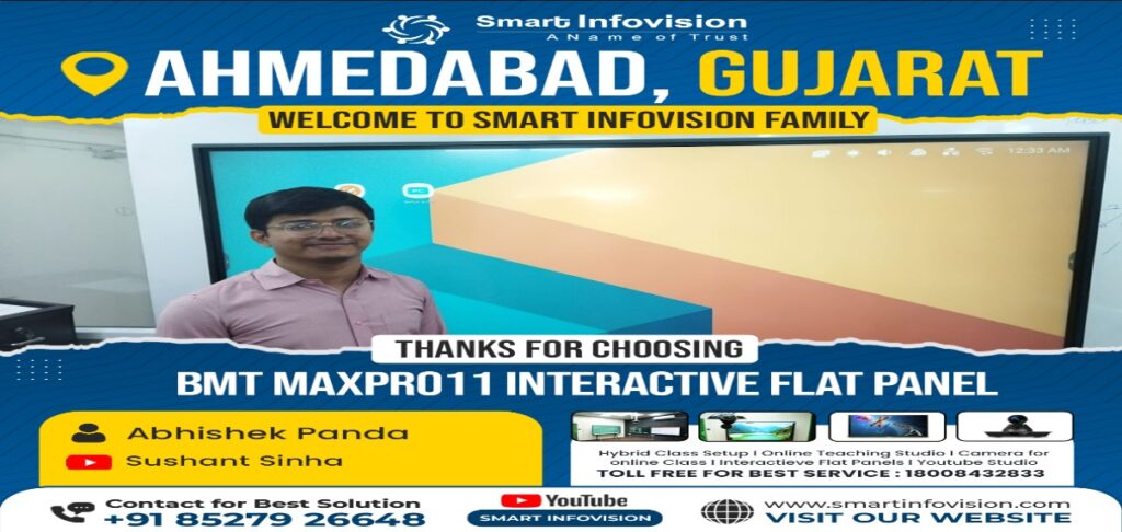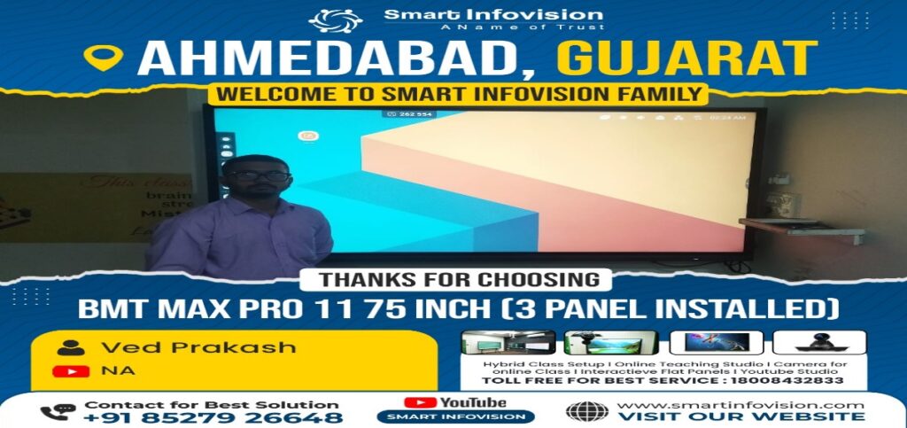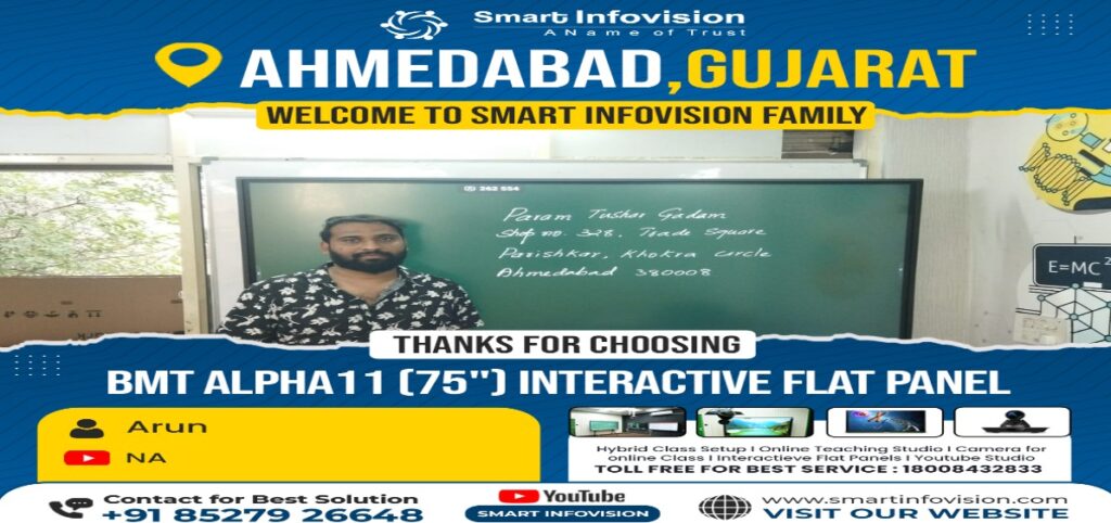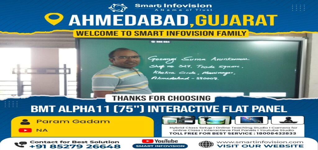 As classrooms across India undergo a digital revolution, Smart Infovision remains at the forefront—delivering world-class educational technology to cities like Ahmedabad. With its smart boards, interactive flat panels, hybrid teaching tools, and custom studio setups, Smart Infovision has empowered educators, content creators, and institutions across the city.