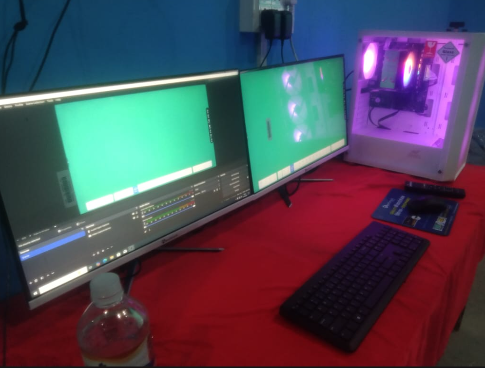 Benchmark i5 server aur dual monitors ko LAN network ke sath connect kiya gaya for smooth streaming and control.