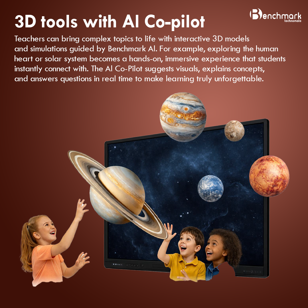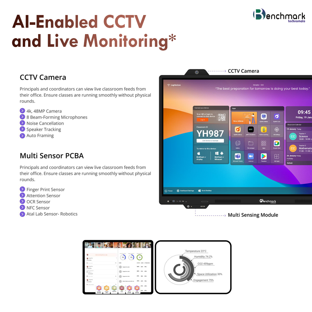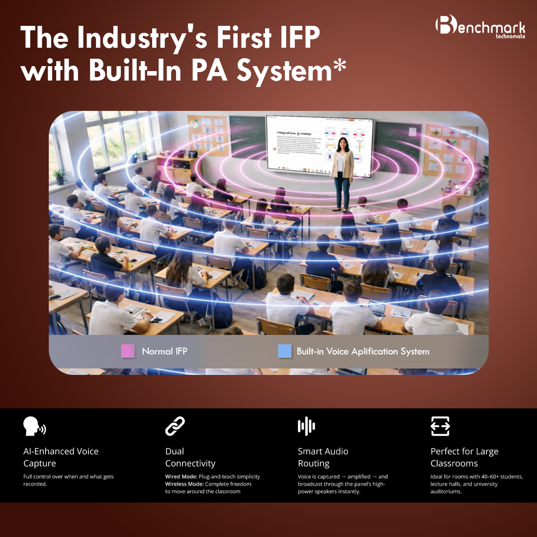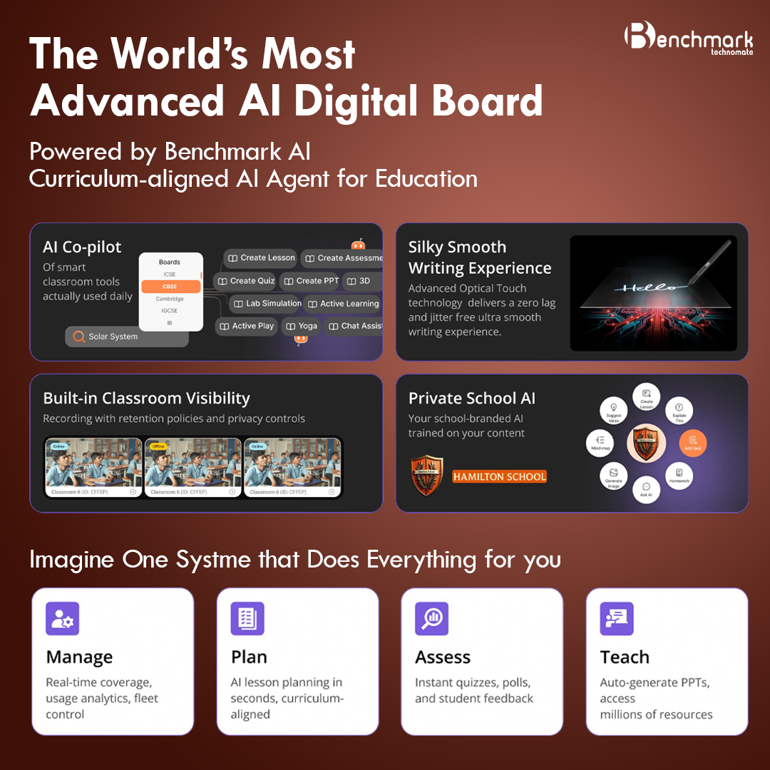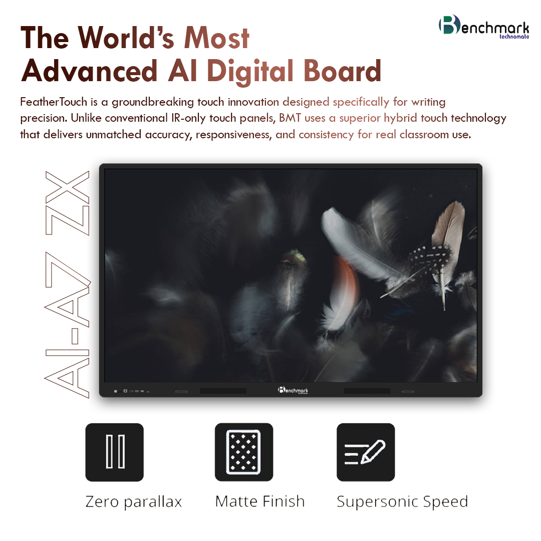 The Benchmark Sigma AI ZX Series is a next-generation AI powered digital board built for modern classrooms that demand more than just display and touch. It combines interactive teaching tools, curriculum-aligned AI assistance, classroom visibility, voice amplification, and advanced writing precision in one intelligent ecosystem.