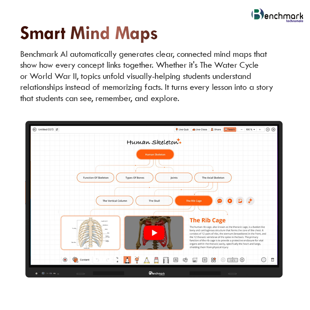 Benchmark AI automatically generates connected mind maps that help students understand relationships between concepts. This improves clarity, retention, and engagement in the classroom.